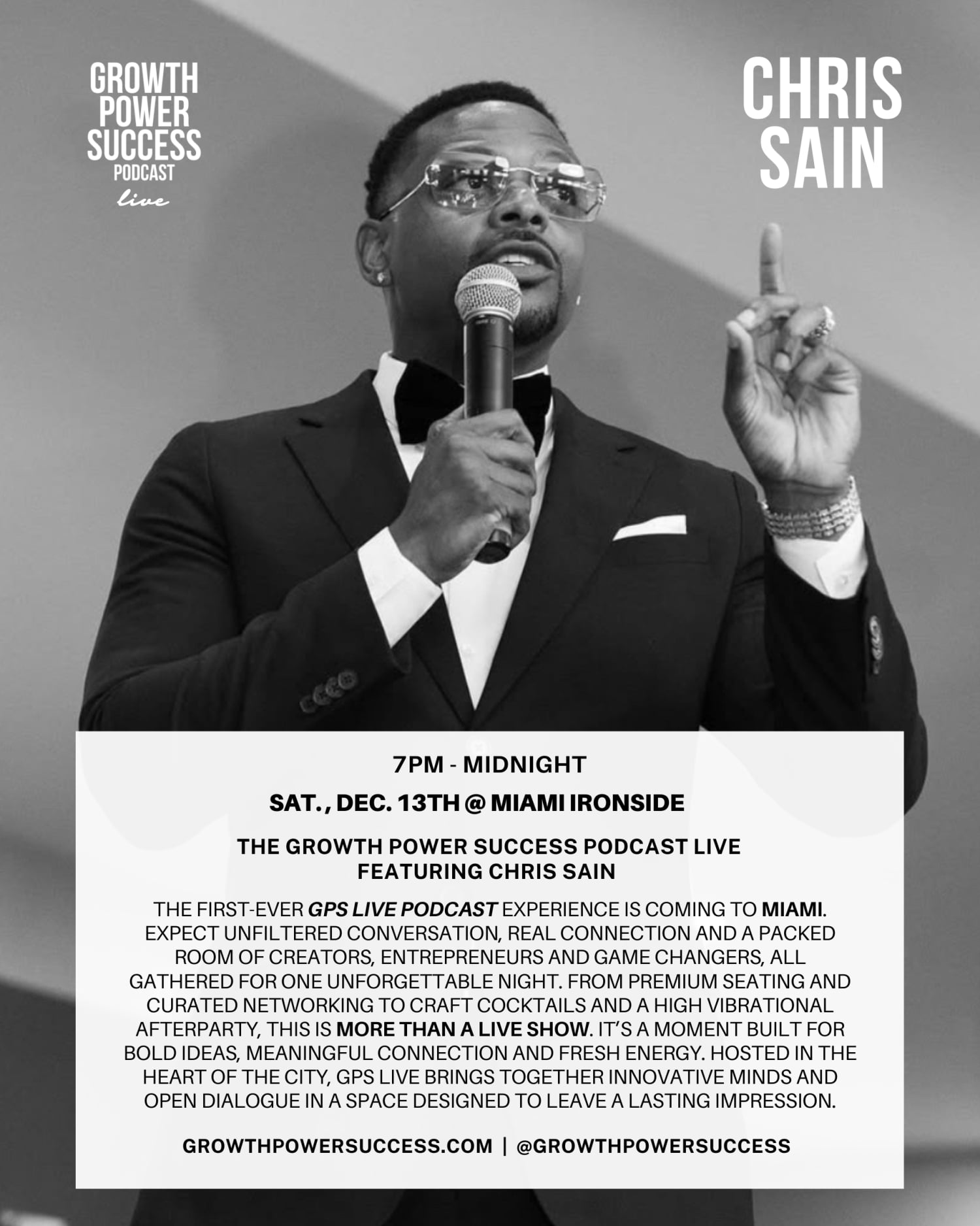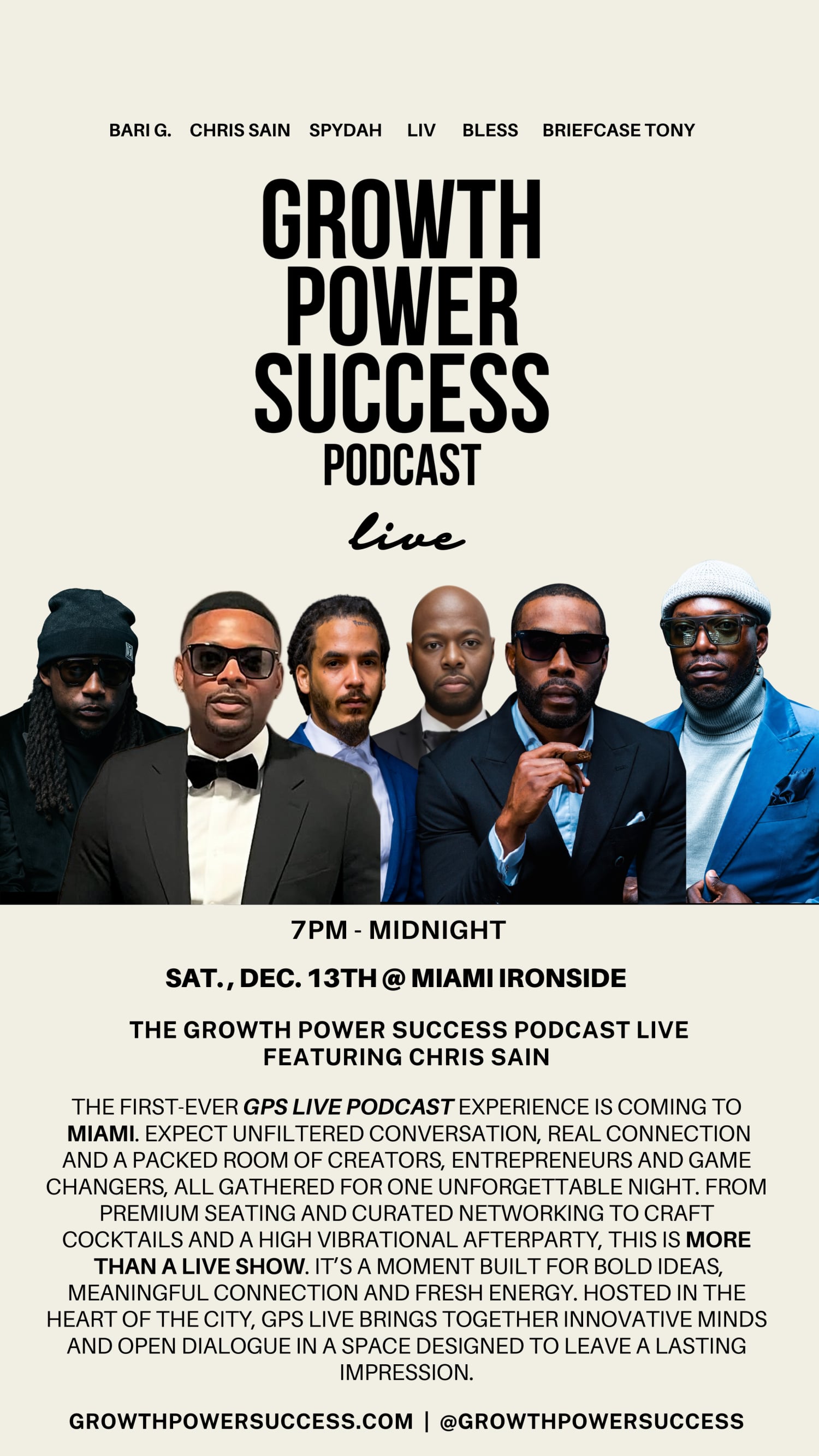 THE FIRST-EVER GPS LIVE PODCAST EXPERIENCE IS COMING TO MIAMI.EXPECT UNFILTERED CONVERSATION, REAL CONNECTION AND A PACKED ROOM OF CREATORS, ENTREPRENEURS AND GAME CHANGERS, ALL GATHERED FOR ONE UNFORGETTABLE NIGHT. FROM PREMIUM SEATING AND CURATED NETWORKING TO CRAFT COCKTAILS AND A HIGH VIBRATIONAL AFTERPARTY, THIS IS MORE THAN A LIVE SHOW. IT'S A MOMENT BUILT FOR BOLD IDEAS, MEANINGFUL CONNECTION AND FRESH ENERGY. HOSTED IN THE HEART OF THE CITY, GPS LIVE BRINGS TOGETHER INNOVATIVE MINDS AND OPEN DIALOGUE IN A SPACE DESIGNED TO LEAVE A LASTING IMPRESSION.