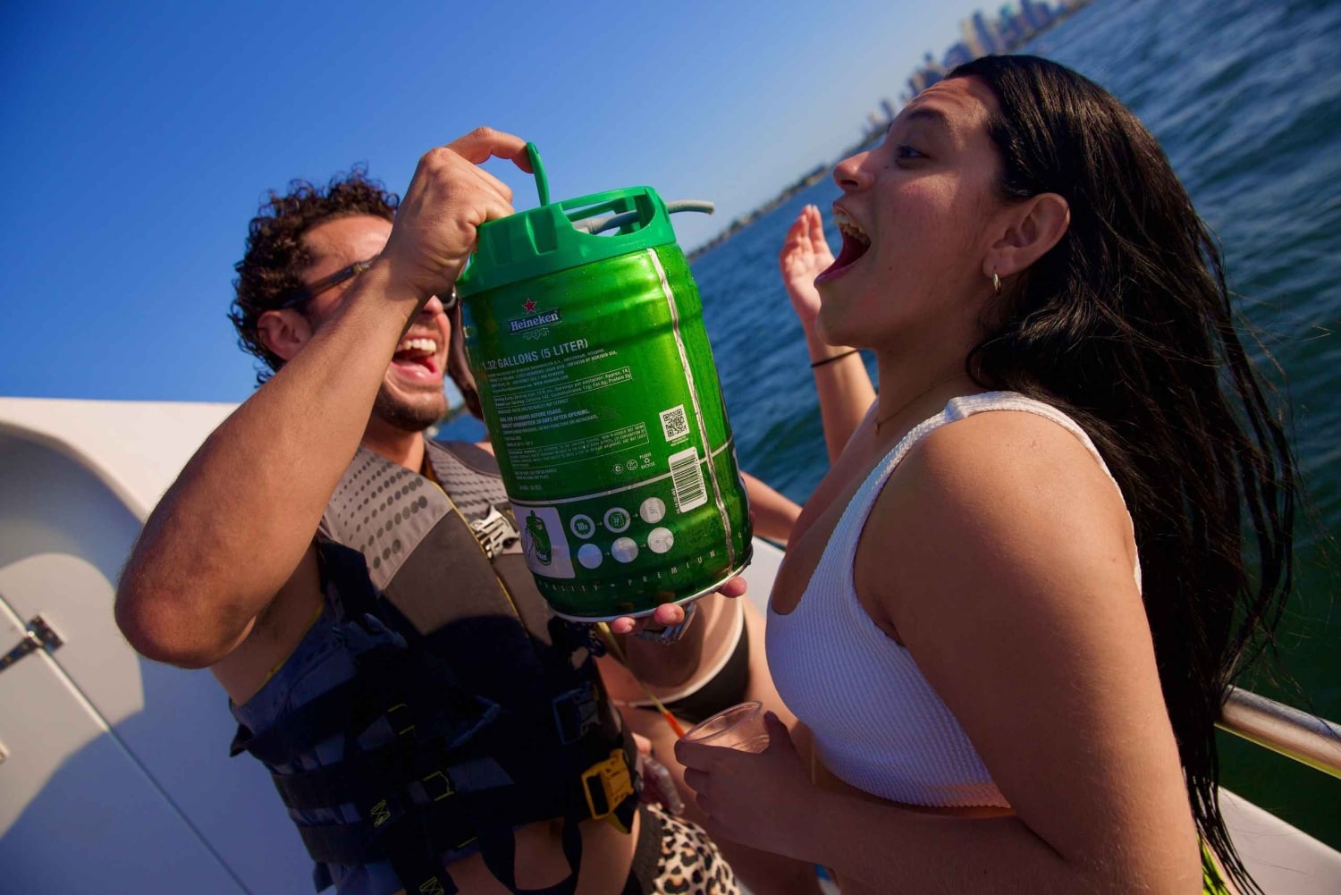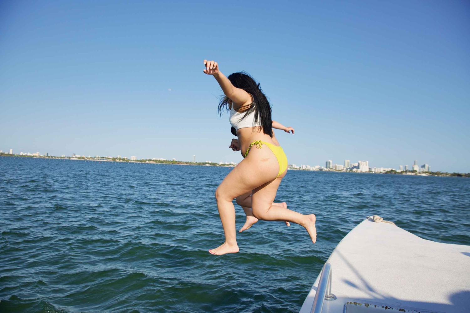 Enjoy a unique party boat Miami style! Jet ski, banana boat and Floating mats An all-included catamaran with open bar, ending with skyline views.