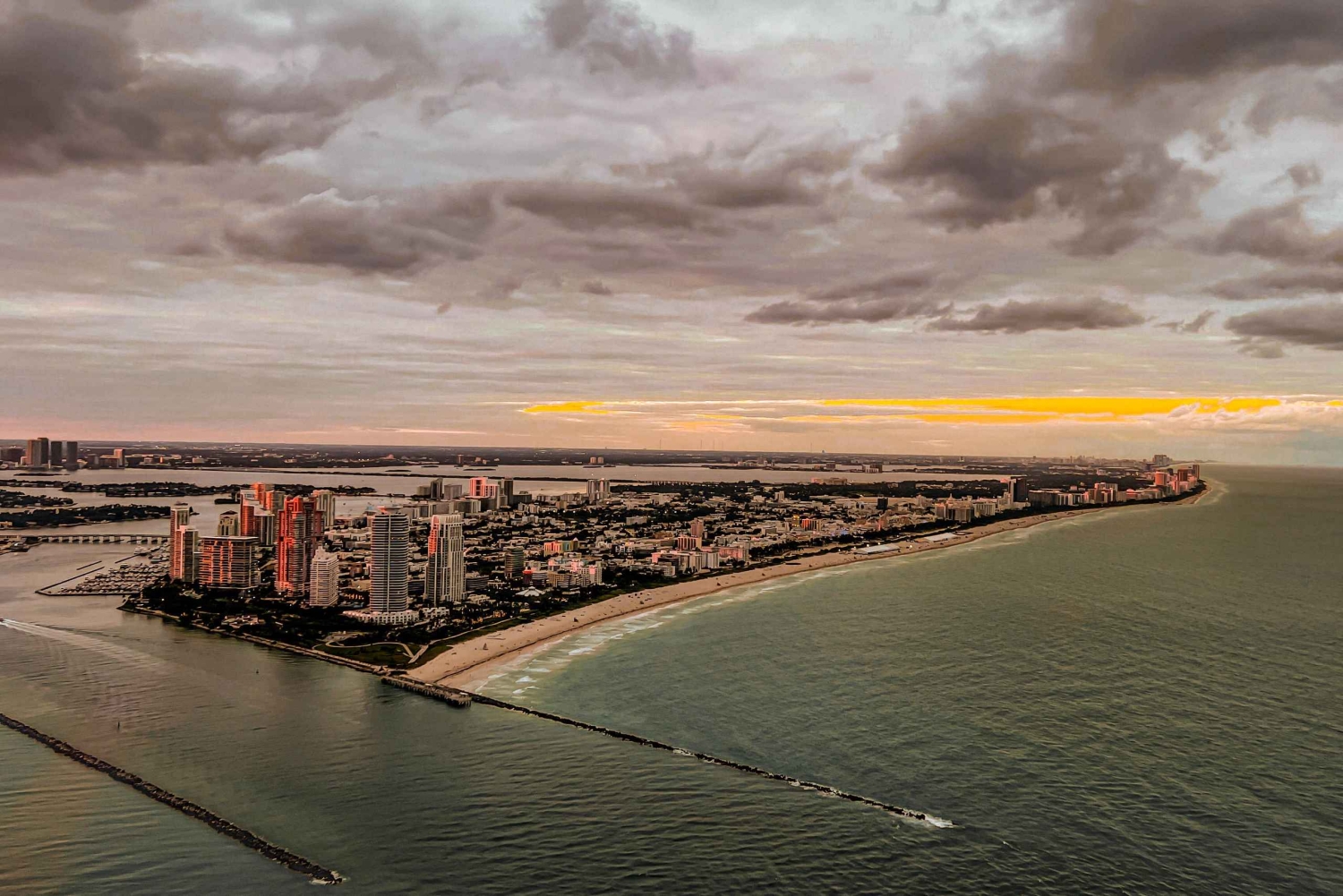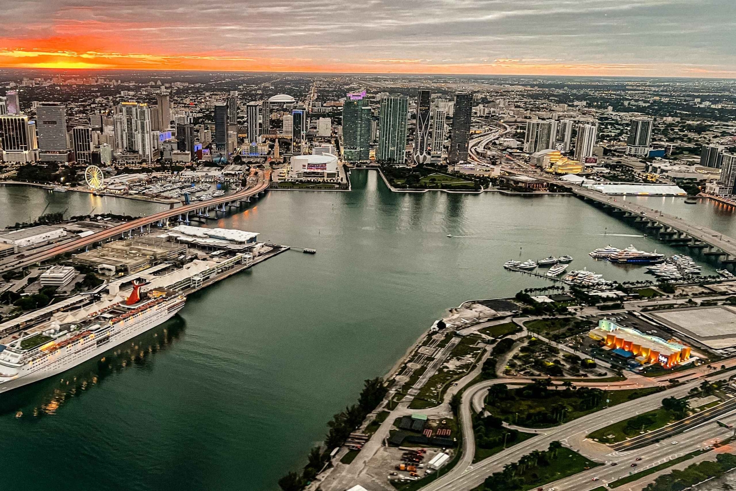 Continue your tour with a complimentary glass of non-alcoholic champagne in hand. Catch glimpses of Miami Seaport and the Miami Seaquarium. Admire the sun's evening rays on the water as you fly over Star Island and Sunny Isles.
