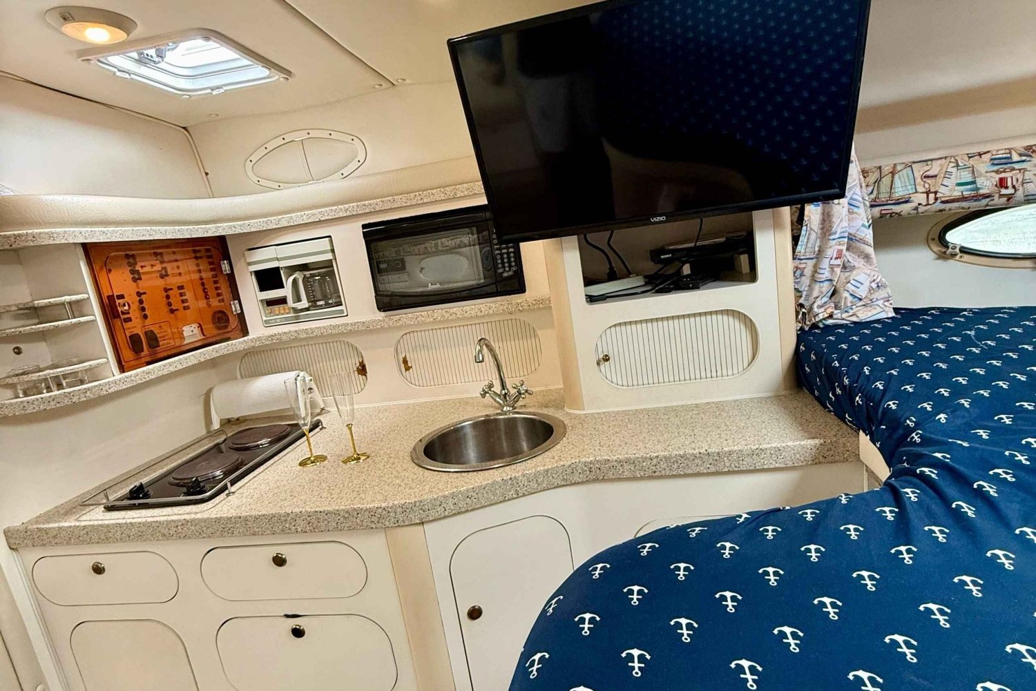 Lisensoitu kapteeni ohjaa teidät luonnonkauniille vesiväylille, joilta voitte ihailla julkkisten koteja, siluettia ja lahden piilotettuja helmiä. Kuuntele suosikkimusiikkiasi Bluetooth-äänijärjestelmän kautta, nauti jääkylmiä juomia kylmälaukusta tai ota aurinkoa kannella, kun jaat ja ryhmäsi jaat jahtin kokonaan itsellenne.