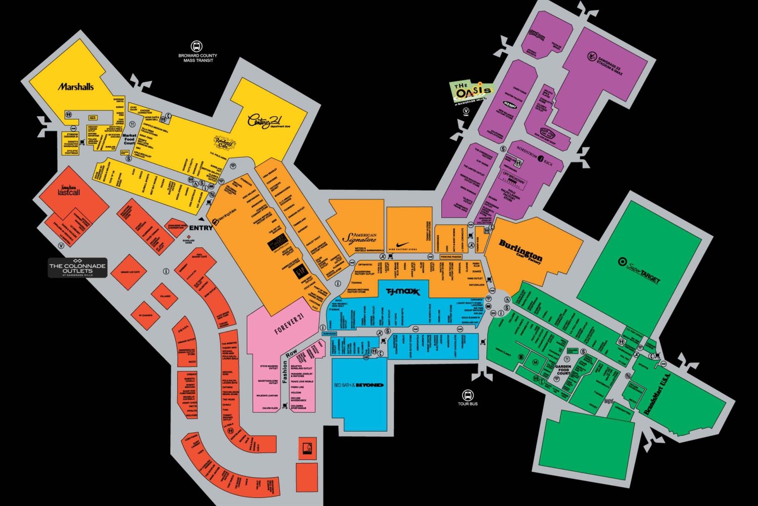Sawgrass Mills, największe centrum handlowe w Stanach Zjednoczonych, ma ponad 350 sklepów, z których wiele to sklepy dyskontowe. Odwiedź sklepy popularnych domów towarowych i marek projektantów, takich jak Bloomingdale's, JCPenney, Nordstrom Saks Fifth Avenue, Gap, Nine West, Calvin Klein i Nike. Dzięki połączeniu ekskluzywnych sklepów, takich jak Gucci, Burberry i Tourneau, oraz popularnych sklepów codziennego użytku, takich jak Best Buy, Bed Bath & Beyond i Marshalls, w tym centrum handlowym każdy znajdzie coś dla siebie.